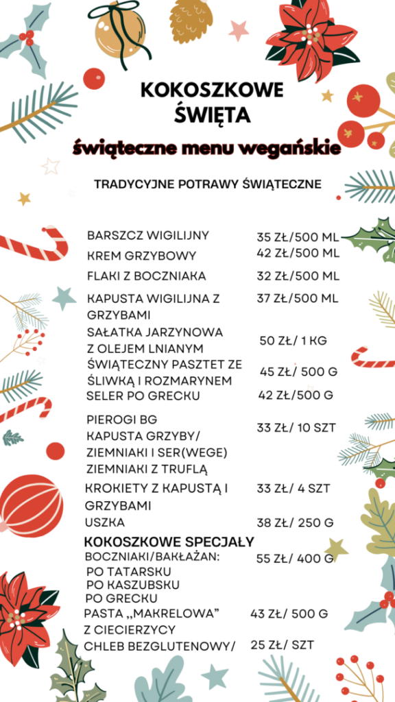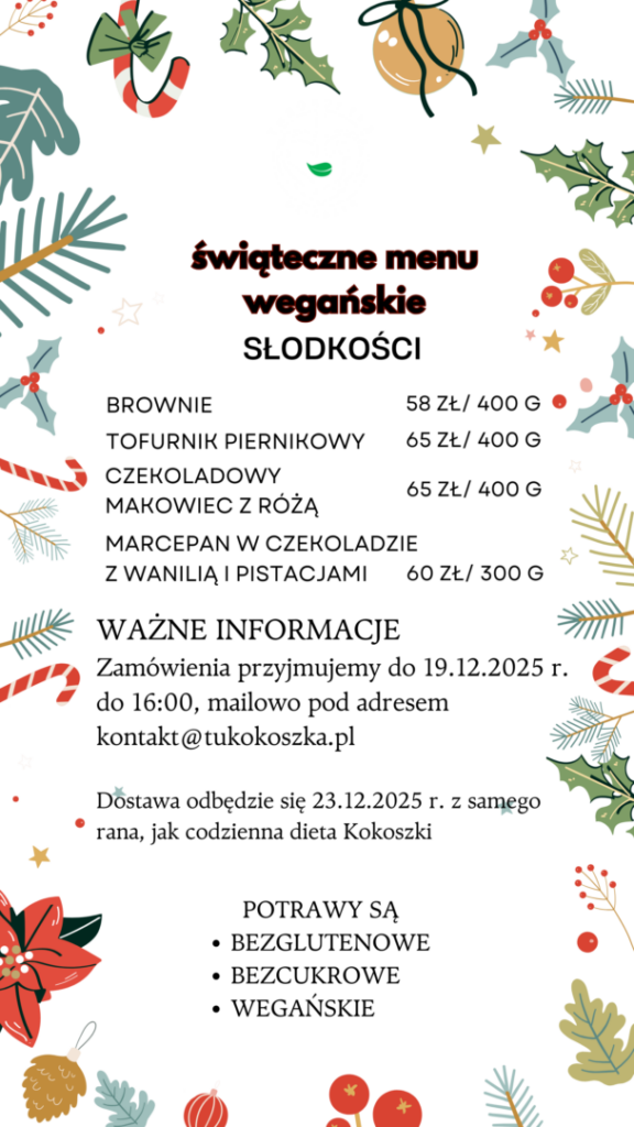 Święta to szczególny czas – chcemy go w tym roku spędzić z Wami. Przygotowaliśmy dla Was wegańskie dania świąteczne, które możecie zamawiać do 19 grudnia, do godziny 16:00 mailowo pod adresem: kontakt@tukokoszka.pl. Dostawę świątecznych przysmaków zrealizujemy dzień przed Wigilią, tj. 19.12.2025 r. w godzinach nocno-porannych – tak, jak w codziennych dostawach naszych diet. Wszystkie produkty są wegańskie lub wegetariańskie, większość bez soi i glutenu. Dania pakujemy głównie w słoiki.